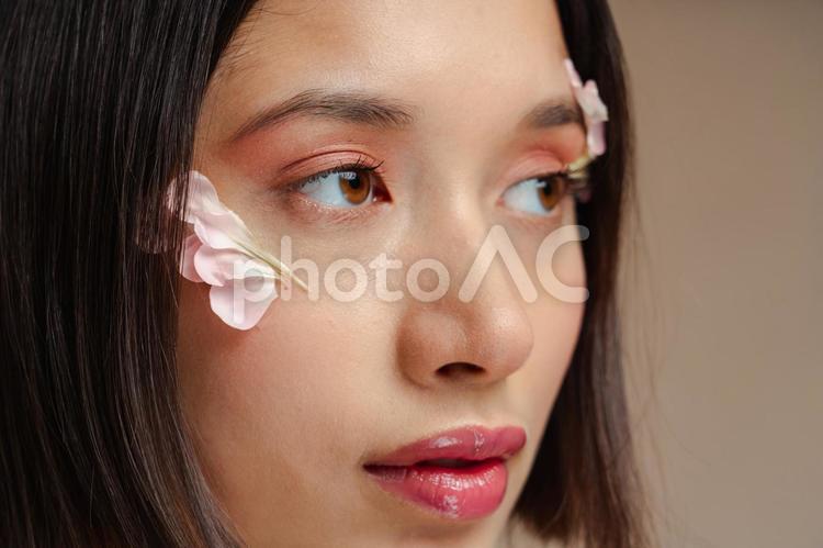 Close-up of a woman with flower petals on her face, female, flower makeup, petal, JPG