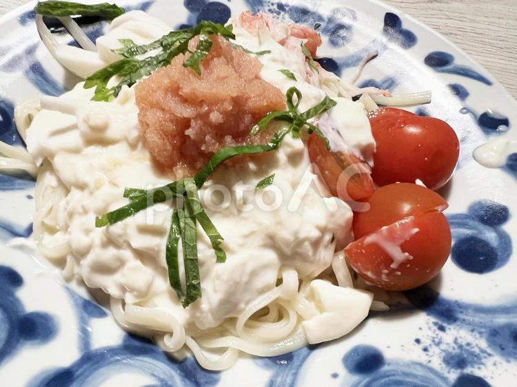 Title: Cold udon noodles with tofu and cod roe, cold udon noodles