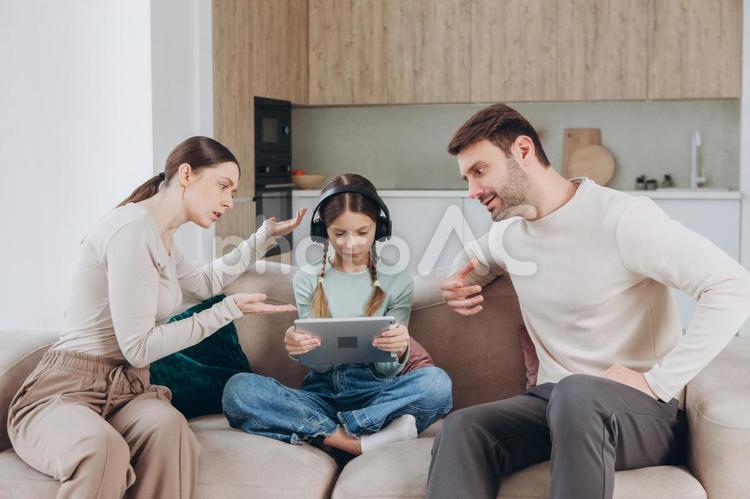 写真素材:娘のタブレットを覗き込んで説教する両親と無視する娘